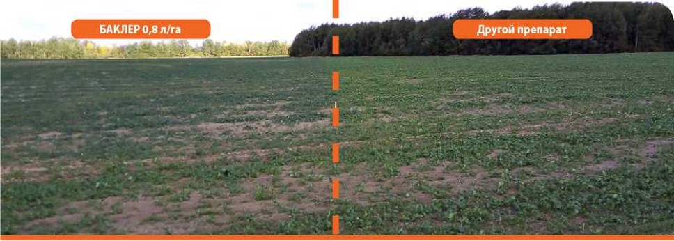 Копыльский район. Более интенсивная зеленая окраска на Баклере 0,8 л/га (слева)